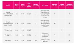 1. Google speech-to-text models are the best-performing models at the time of this benchmark(lower WER) for both agent and caller transcriptions.