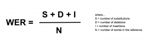 The metric used to evaluate the model’s performance is WER (Word Error Rate). This metric quantifies the mistakes made by the model, taking into account the substitutions, the mistaken insertions, and the deletions done by it. The lower the WER is, the better the model performance is. Since the WER can be greater than one, it isn’t a transcription accuracy percentage. The WER metric is defined as: